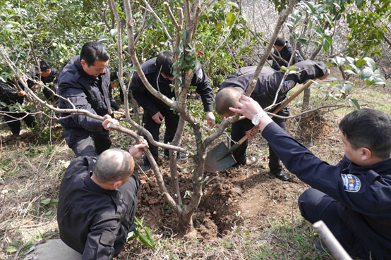 植樹期間,大家分工合作,干勁十足,克服了坡陡、路滑、樹大的客觀因素,揮揪、扶苗、踩實,栽種了桂花、梅花等十余株棵,為美化烈士安息環境增綠添彩,充分展現了鎮江保安的風采。