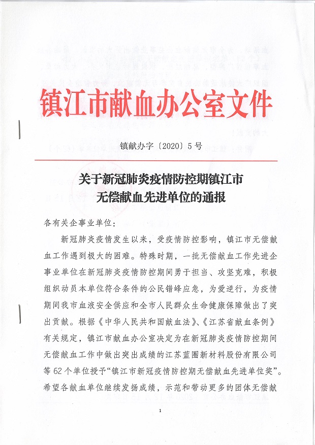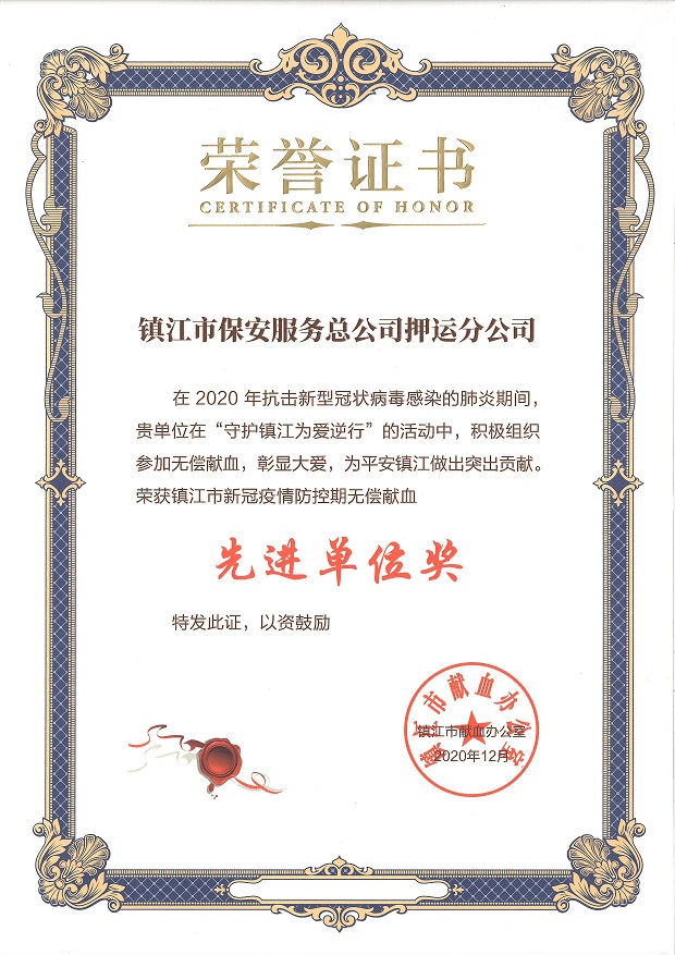 近日,喜訊傳來,鎮江市獻血辦公室授予我公司押運分公司新冠疫情防控期無償獻血先進單位獎。