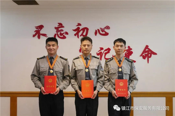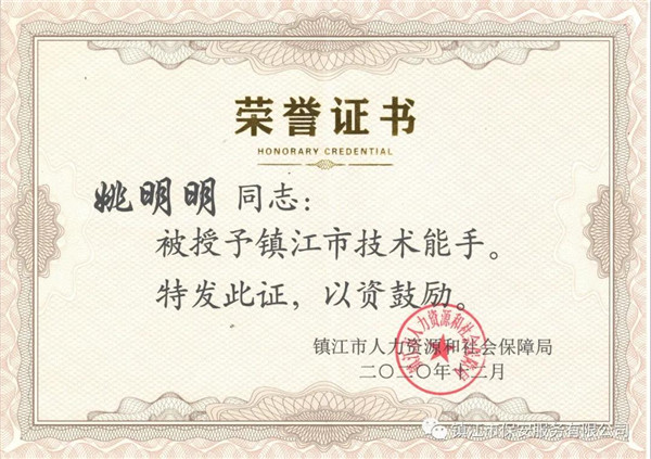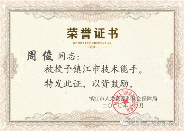 周俊、陶良輝、姚明明三名同志分別獲得武裝押運工種、人力防范工種、安全技術(shù)防范工種的第一名,并獲頒鎮(zhèn)江市人力資源和社會保障局授予“鎮(zhèn)江市技術(shù)能手”榮譽稱號。