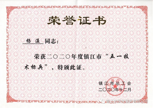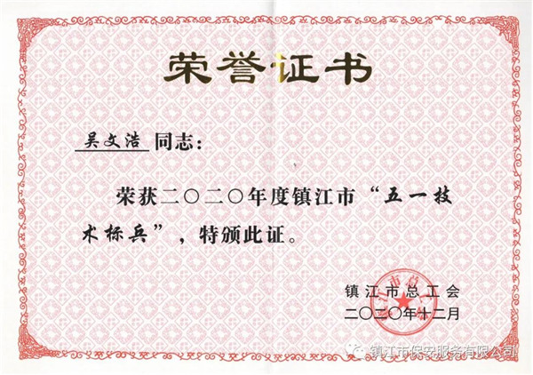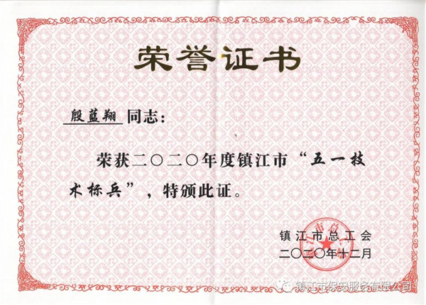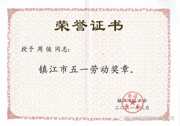 因周俊同志在競賽中表現(xiàn)突出,由市總工會授予該同志“行業(yè)技能狀元”及“鎮(zhèn)江市五一勞動獎?wù)隆睒s譽稱號。